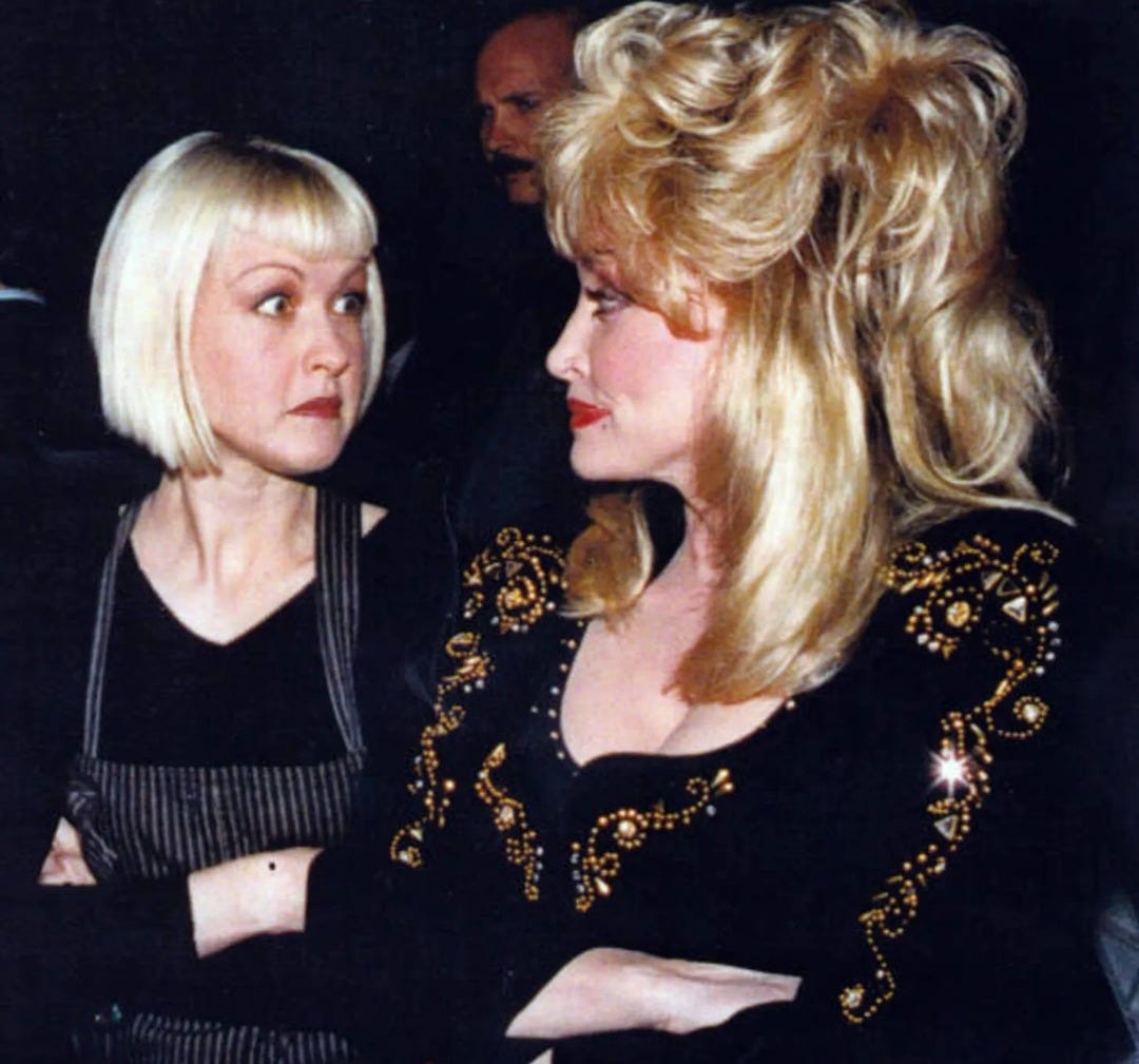 1981 Cyndi Lauper meets Dolly (I don’t think Dolly is used to people staring at her eyes?):