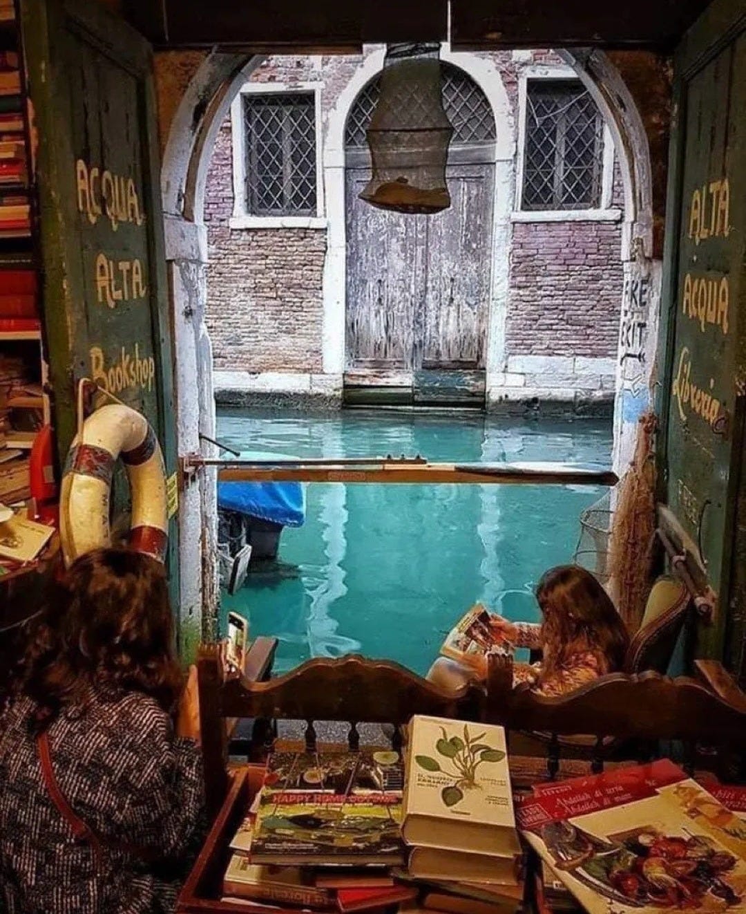 A reader in a Venice library ignores the rising damp… must be a good book!