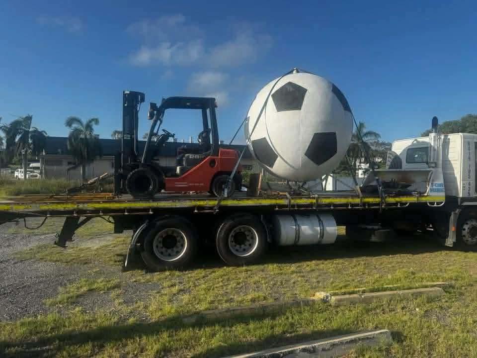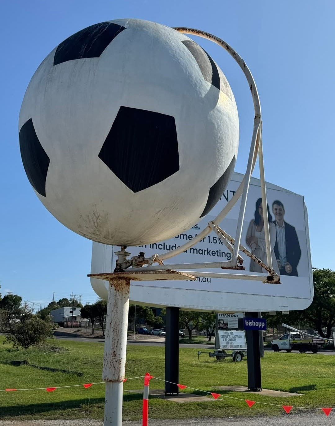 The wind was strong enough to bend the stand holding up the Big Soccer ball: