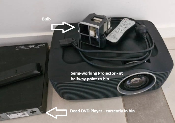 With a cry of, “Sweet Tap-Dancing Buddha!” I dropkicked the projector into the bin.